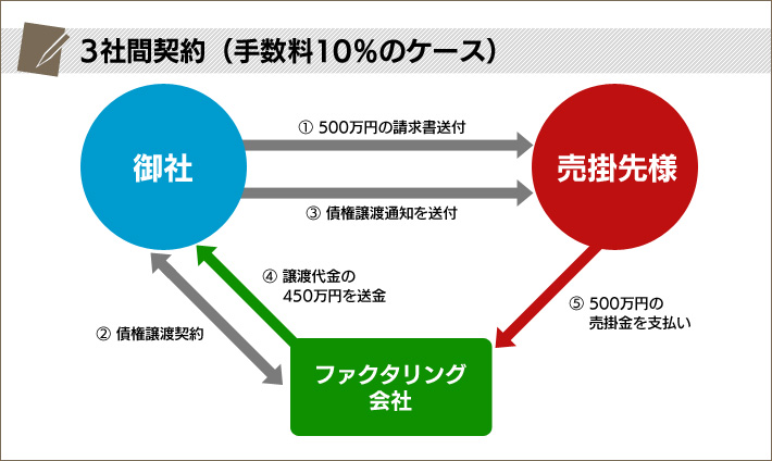 3社間契約は、売掛先の承諾をいただいた上で、売掛金をファクタリング会社に売却し入金日が到来したら売掛先から直接ファクタリング会社へご入金いただく契約です。