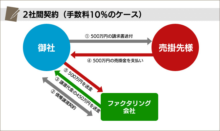 一方、2社間契約はノンリコース(万が一譲渡頂いた債権の売掛先が倒産してしまったとしてもお客様に請求をしません)契約といい、3社間とは違い、契約、取引はお客様とファクタリング会社のみで行ないます、売掛先に承諾をもらわず、ファクタリング会社に売掛債権を買取してもらい、売掛先から入金があったらそれを直接ファクタリング会社に支払っていただく契約です。